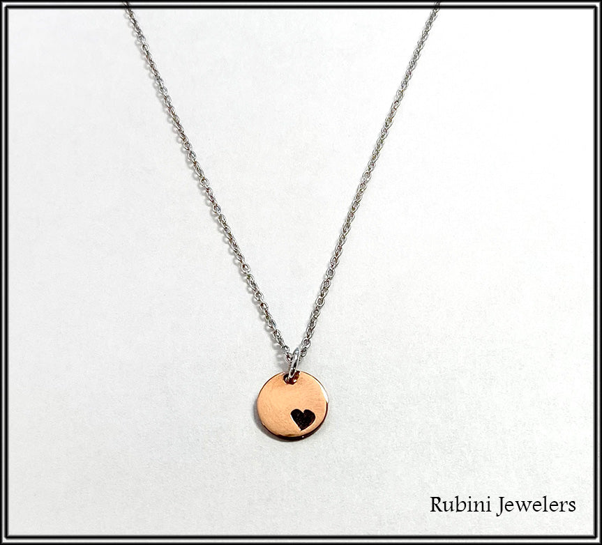 Copper disc 8mm diameter laser engraved jauntily with a solid heart. This necklace is neither big nor flashy, but serves as a reminder that in order to love others we must first love ourselves or there is no love to offer. It is laser engraved off center purposefully to represent the imperfection that we all have and that we all must love and embrace to lead happy lives. Both the jump ring and the chain are stainless steel. Chain is 1mm thick 20 inches long.