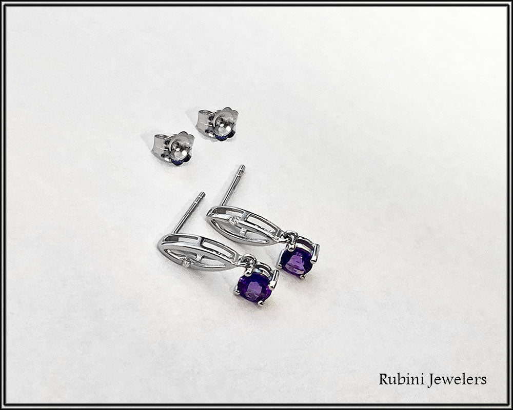 14kt white gold. Amethysts are 4mm, .52carats total weight and 2 channel set diamonds are .018carats total weight. Earrings are ~17mm long (3/4 inch). 14kt gold friction backs are included. Rhodium plated.