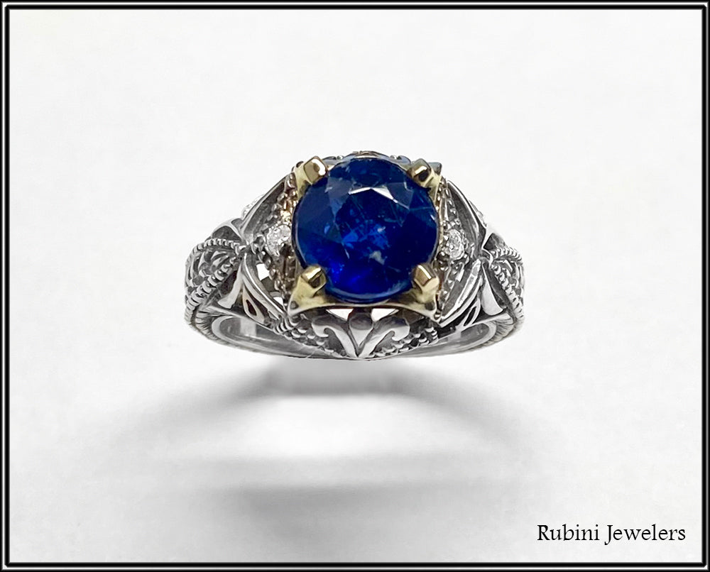 Sterling Silver and 14Kt Gold Faux Sapphire with Diamonds Antique Reproduction Ring