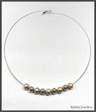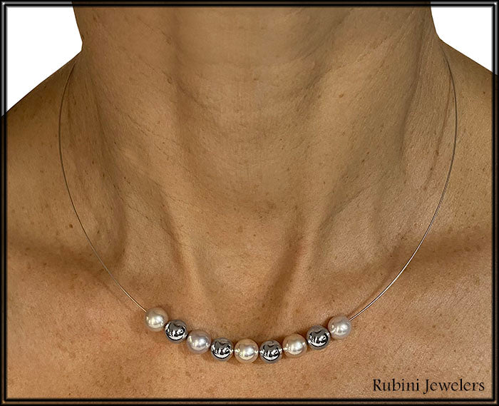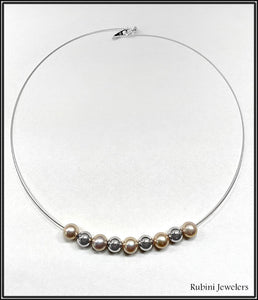 The slightly rose-peach tone cultured fresh water pearls and 14k white gold beads are all 8mm diameter. They slide freely on the wire.