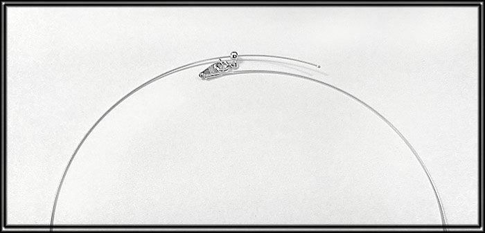 The wire choker is 18k white gold 17.5 inches long and .5mm thick. Clasp is a spring ring. The length is adjustable by sliding the receiving end bead along the wire with care :o)