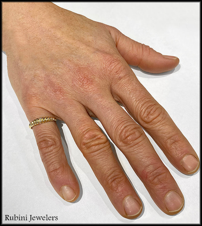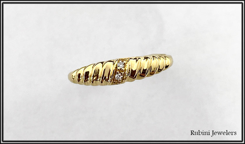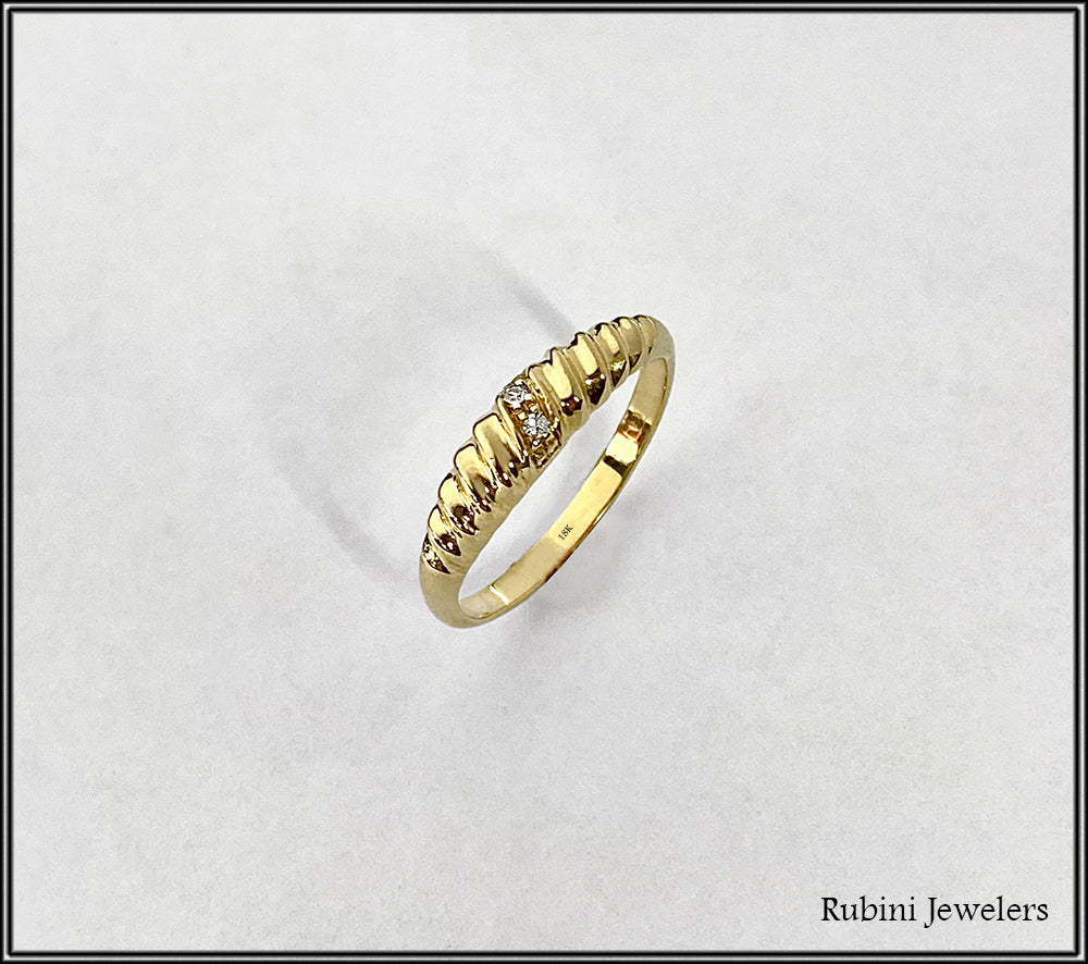 18kt yellow gold with .04cts natural diamonds in the center. Dome is 4.5mm wide and 2mm tall. The band is half round, measures 2mm wide and 1.3mm thick.