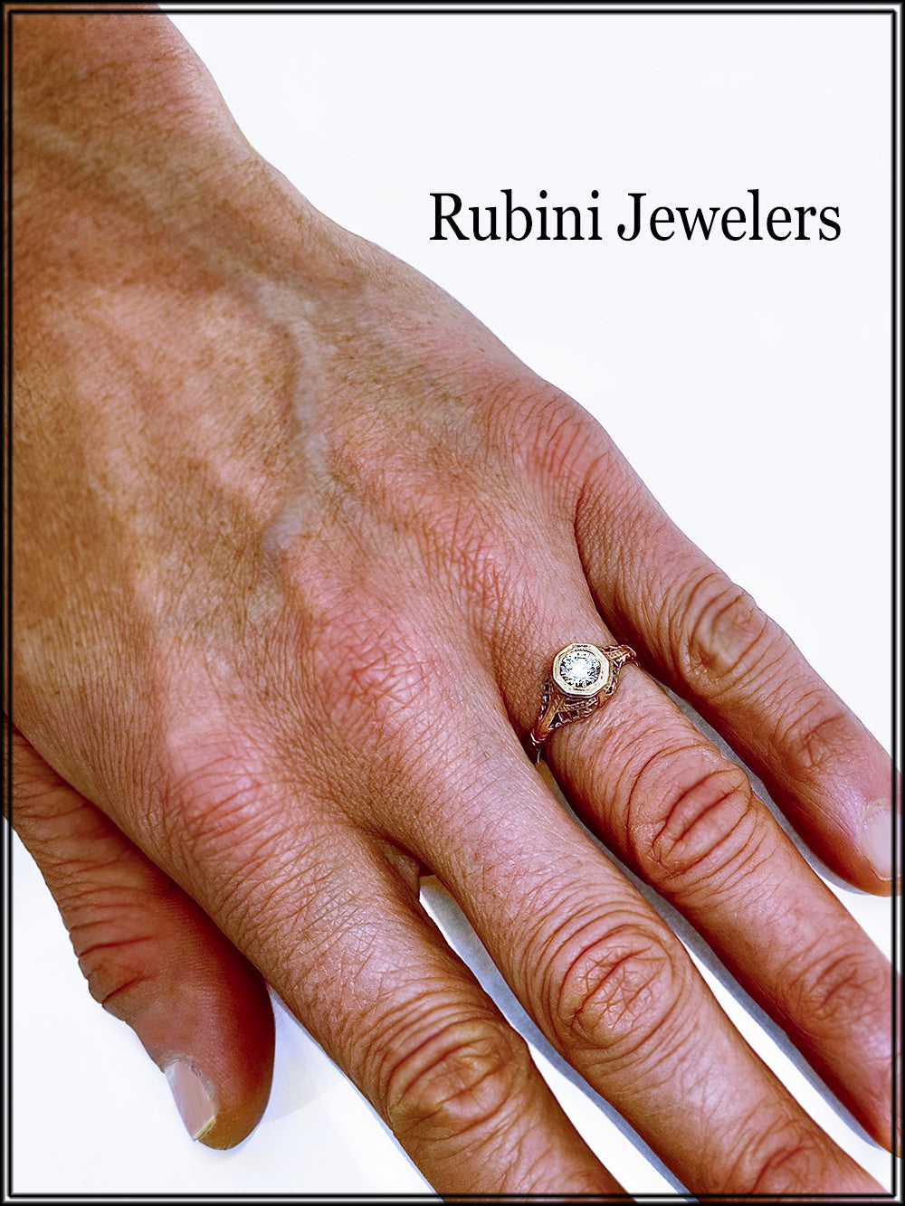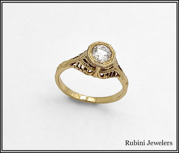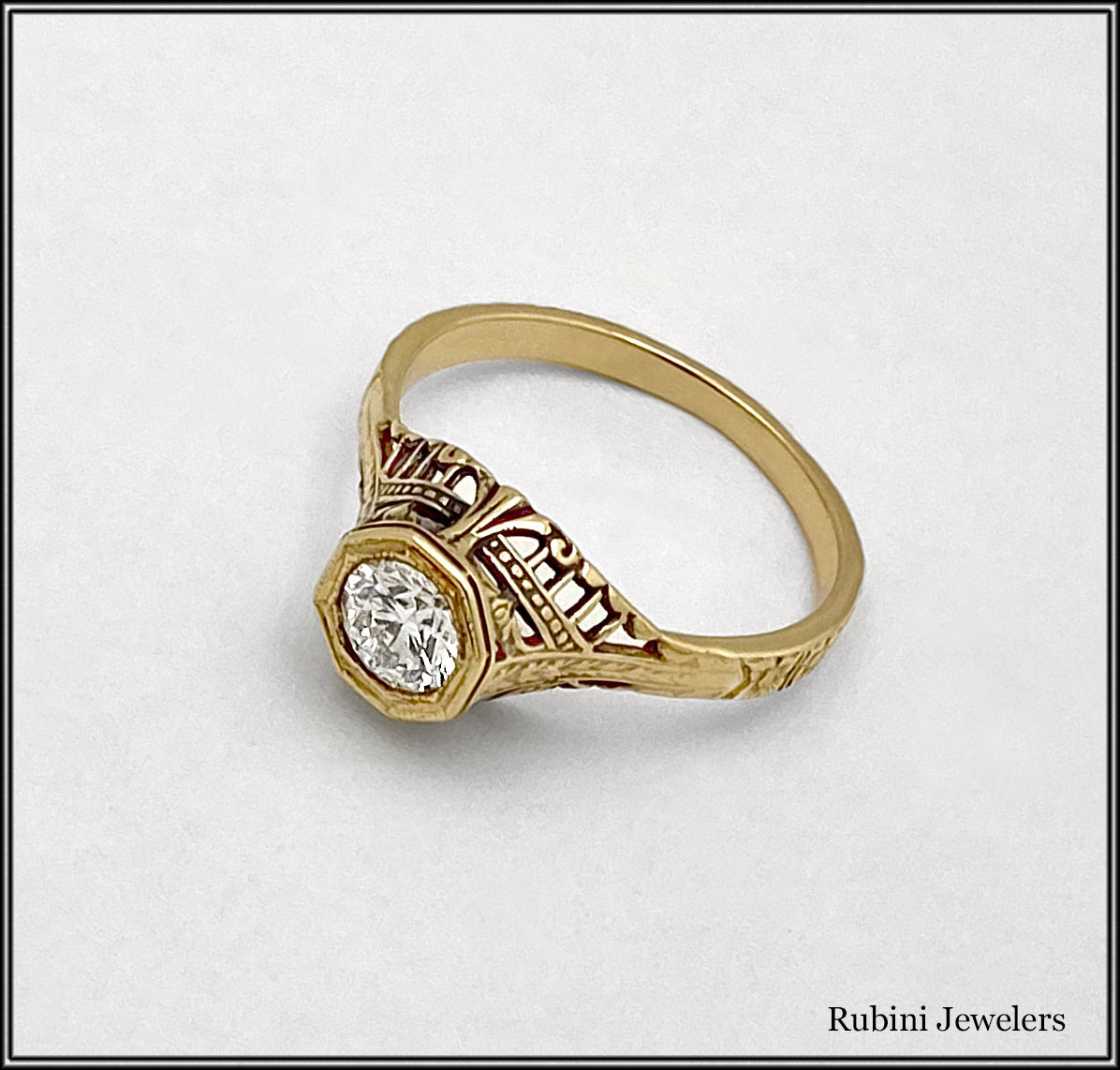 A modern reproduction of a classic antique. 14K yellow gold, tall bezel setting, .50ct round RB Diamond, GIA E SI1 (ARC 3K).