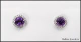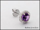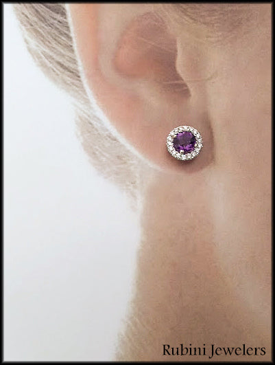 5mm round checkerboard amethysts with diamonds halo in 14K white gold stud earrings.