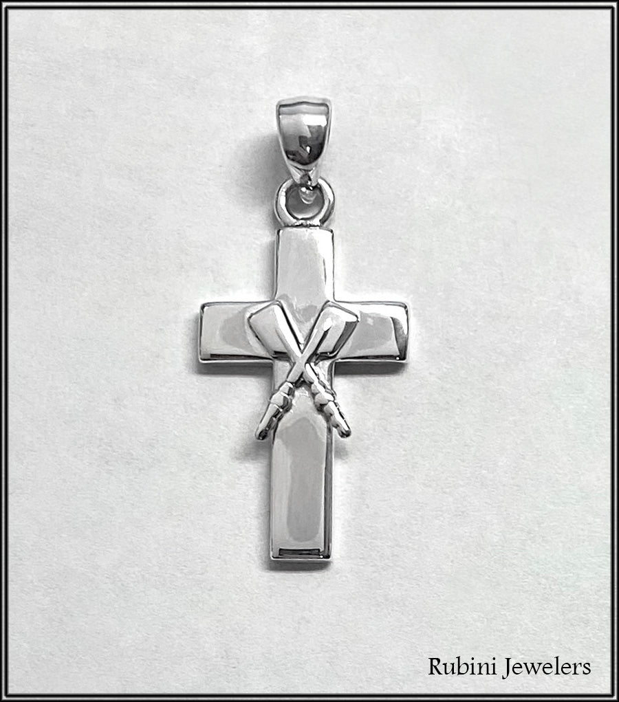 Sterling Silver. Arms of cross are 4mm wide and cross measures 1 inches long and just over 1/2 inch wide. Bail and loop on top add ~1/4 inch. Crossed oars are 1/3 inch long. Cross is appropriate for both men and women.