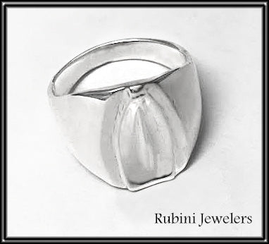 Sterling Silver. Tulip Signet style ring has a big look but is not significantly heavy due to being carved out behind the top. The classic rowing blade shape tulip is 18mm top to bottom and top portion of ring is 12mm across.