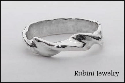 This sterling silver band is 5mm wide and has been twisted to give it a unique spiral design. It has been given a hammered finish and is a custom piece by Jaime Rubini.