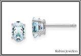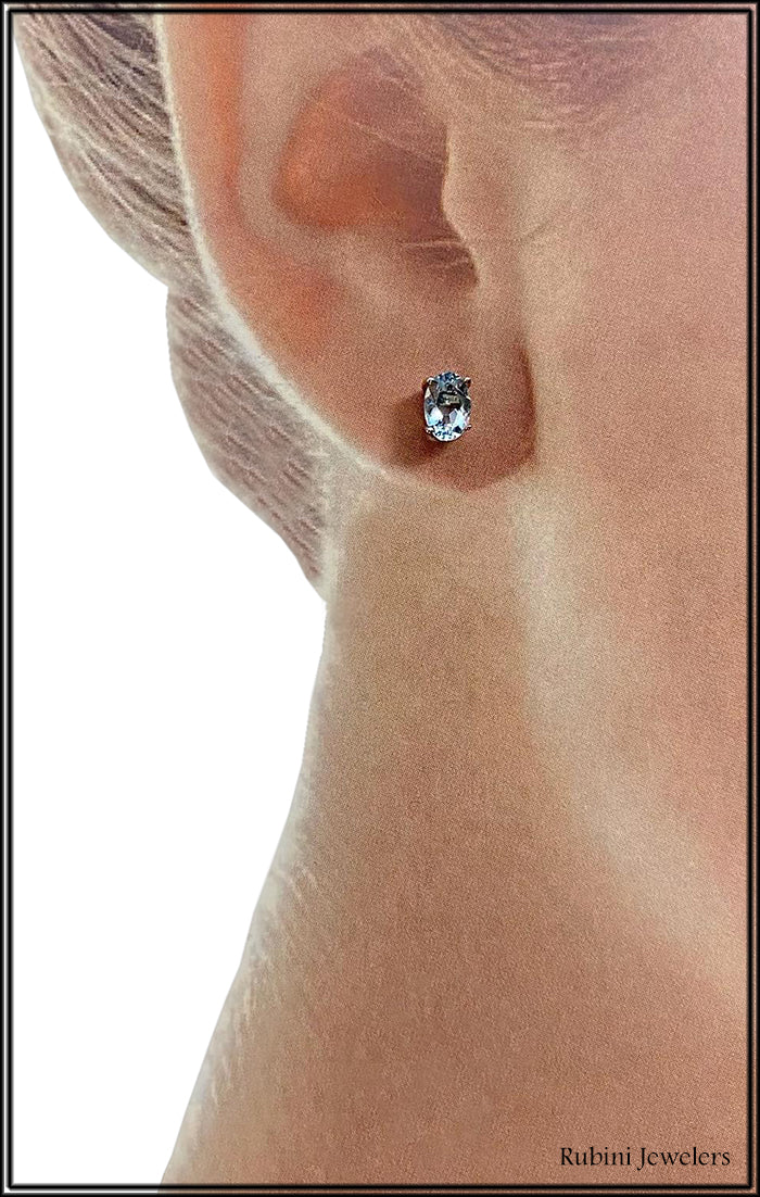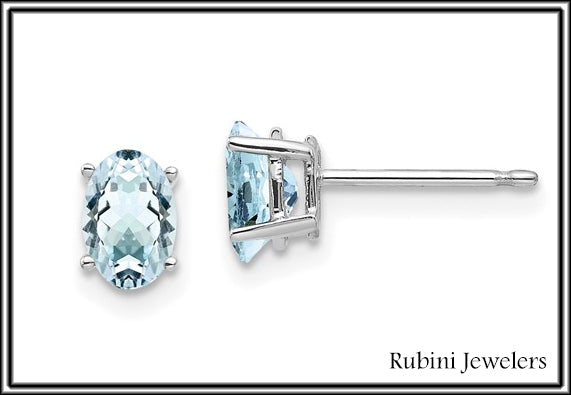14kt white gold oval basket set with a natural 6mm by 4mm oval aquamarine . They have standard posts and friction backs are included.