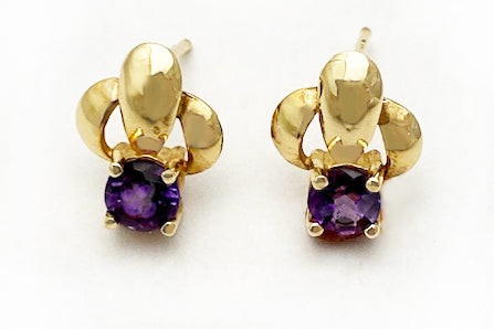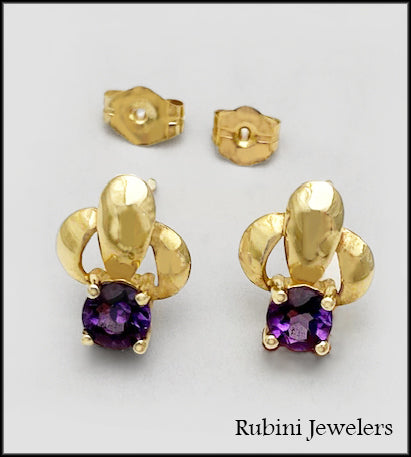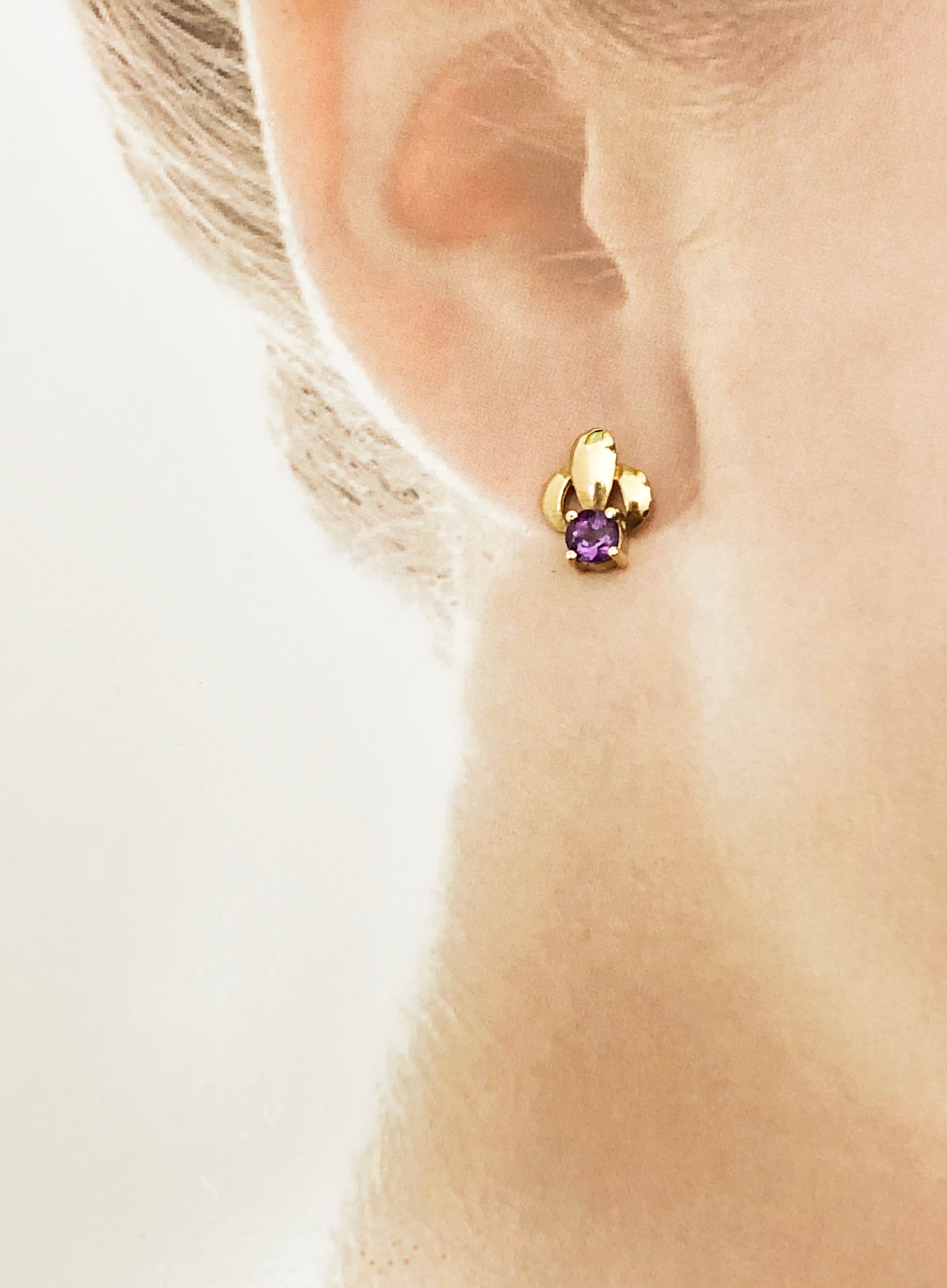 Genuine amethysts measuring 4mm are housed within 4 prongs below three arches of 14kt yellow gold in these earrings. Earrings measure 11mm long by 10mm wide. Yellow gold and purple represent royalty, and these embody the richness their colors are assigned. Post is located behind the top knob. Amethyst is known as the month of February birthstone, a gemstone associated with qualities of peace, courage and stability. And frankly, we all could use a bit more of this during what can be a cold unfriendly feeling time of year.