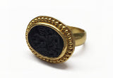 This 22k gold ring features an etching of a man on horseback holding a banner carved into it's solo black stone. Our best guess is that it's St. George and the Dragon.