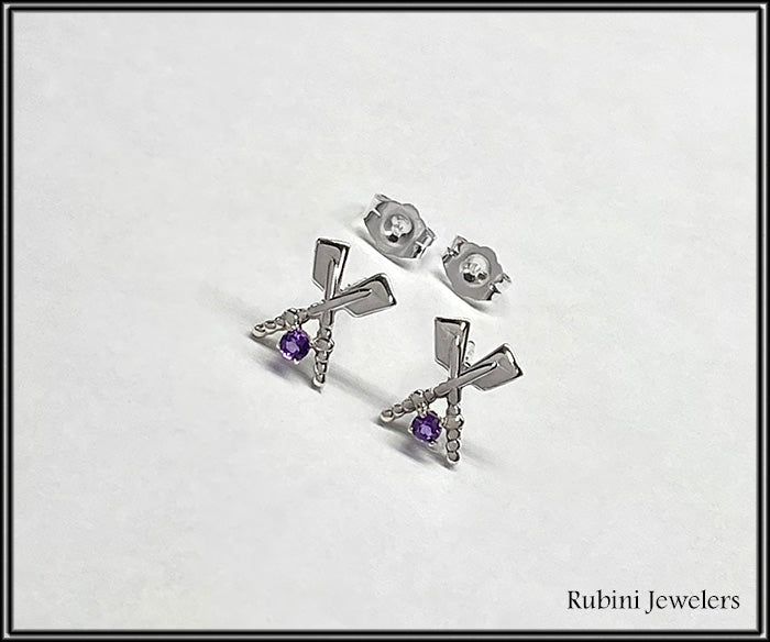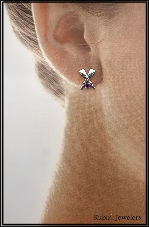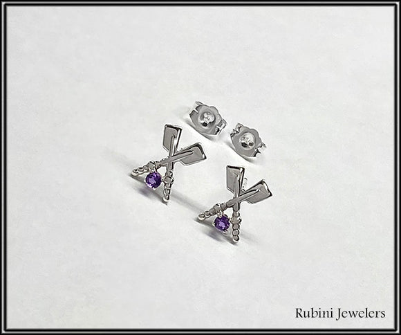 Sterling Silver. Genuine natural amethyst is 2mm, and the crossed oars earrings measure ~10mm.