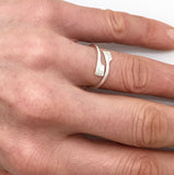 Sterling silver. The hatchet blades on this ring are just 7mm by 4mm, making a delicate statement that is not heavy on your hand. Although it is adjustable, we need to know approximately what the finger size is for ease of adjustment. When adjusting, please hold only from the band, not the blades! We can also make you a soldered version if preferred, just write a note with your order. Clean sterling silver silver with baking soda or a polishing cloth.