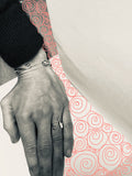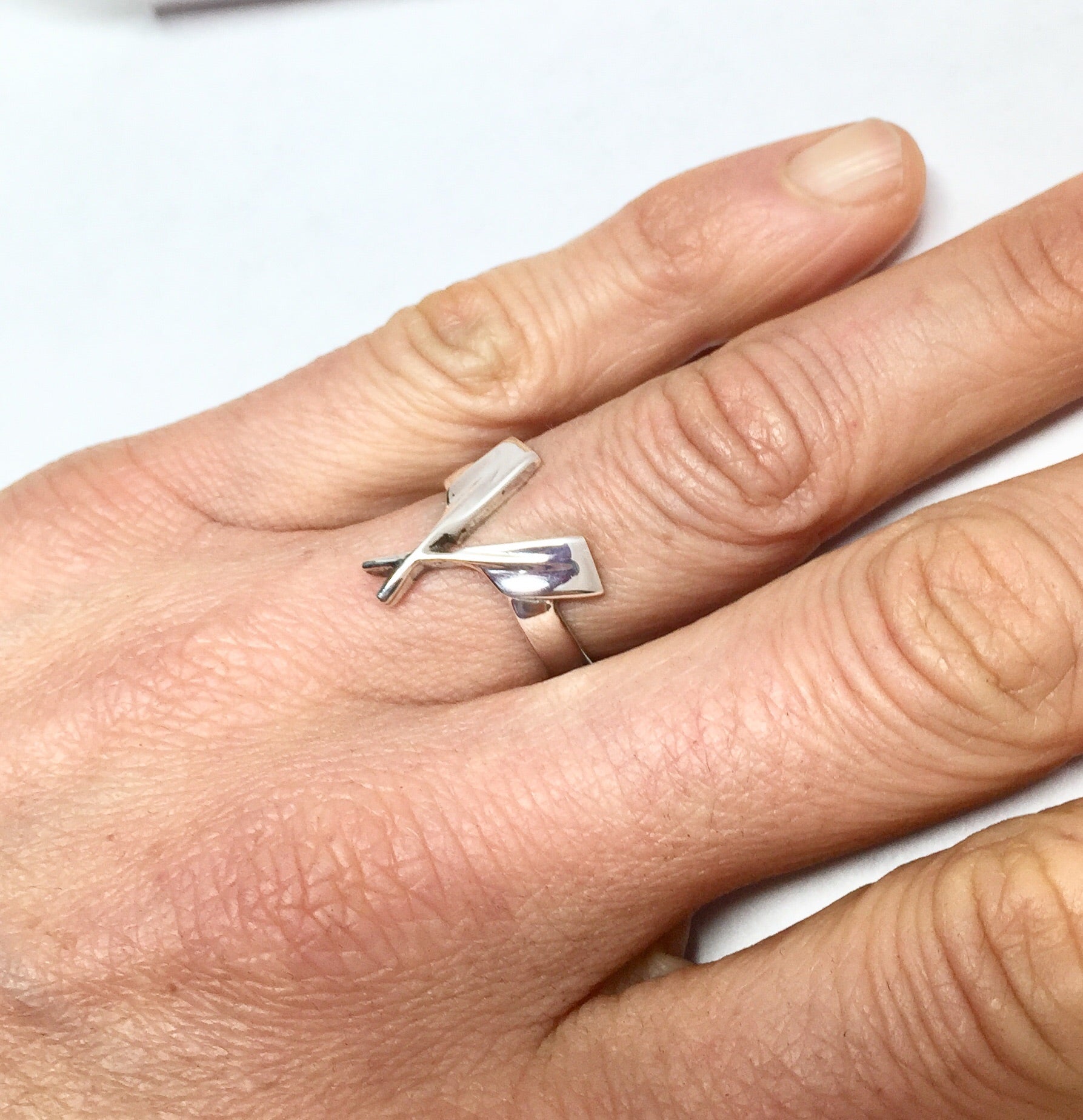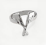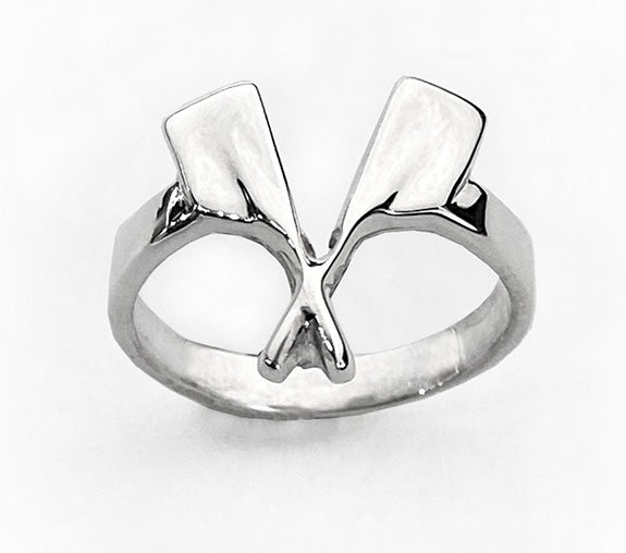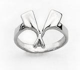 Sterling silver. This ring can represent rowing in general or sculling, as crossed oars historically do. Top of ring is about 16mm by 16mm, and each blade alone measures 10mm long by 5mm wide (1/2" long and 1/4" wide.) The design is dramatic and surprisingly wearer-friendly.