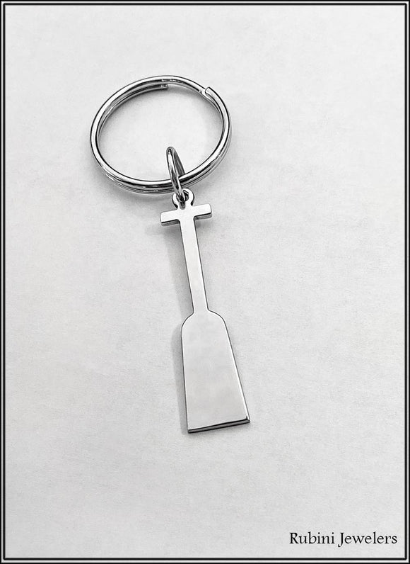 Stainless Steel. Dragon Boat paddle keyring with loop on top is 2 1/8 inches (55mm) and 2 1/3 inches long (60mm) including the jumpring.