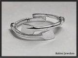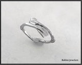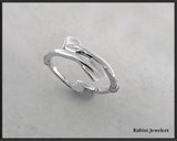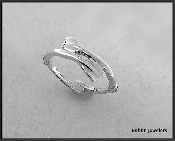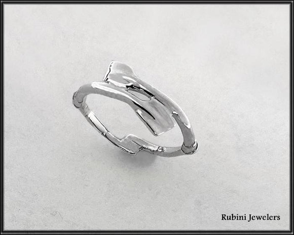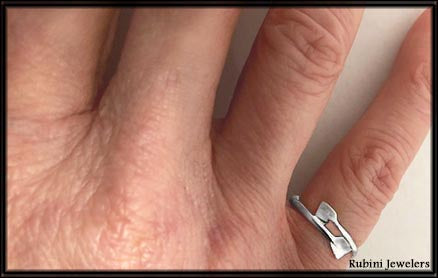 Sterling Silver. This ring has 2 entire oars complete with handles soldered in a bypass formation to form a soldered style ring. Rowing blades, either hatchet (angular shape) or tulip (symmetrical classic shape) are 3.5 to 5mm long (0.2 inch) long. This style is similar to our R.34 ring which has bigger blades and no handles.