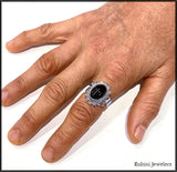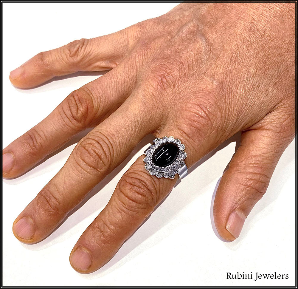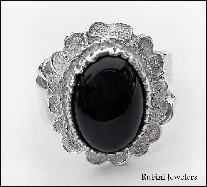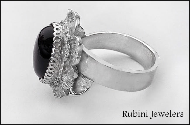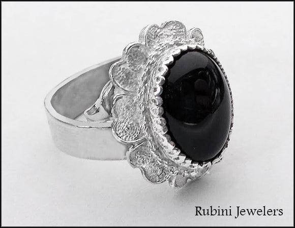 This lovely ring features a 14x10mm bezel set black onyx cabochon with a beautifully detailed floral filigree pattern around it.