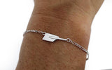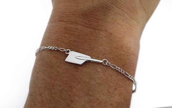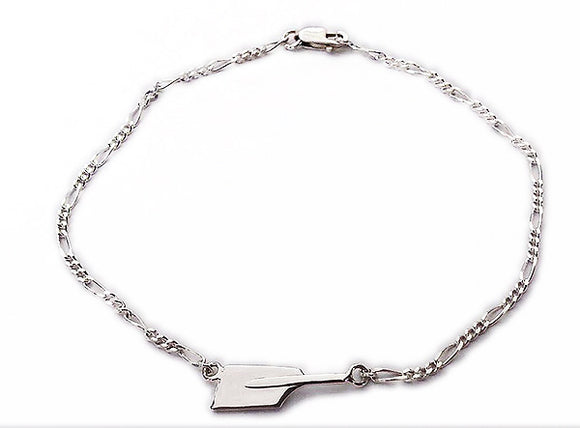 Sterling Silver. Bracelet has a small hatchet style rowing oar on a 1.5mm wide figaro style chain with a lobster clasp.