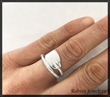 Sterling silver. This is our classic tulip oar wrap ring. Its iconic symmetrical blade is widely recognized as a symbol of rowing. The blade itself measures 15mm by 9mm (5/8" long and 1/3" wide.) Soldered sizes.