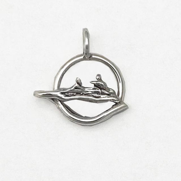 Sterling Silver. This pendant shows the stern end of a rowing boat with just the coxswain and the stroke seat rower. Diameter of circle is 12mm and length of pendant from top of bail loop to bottom of circle is 22mm.