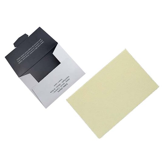 7-1/2"L x 5"W (190 x 127mm), comes in a paper folder. Sunshine® cloth is impregnated with special micro-abrasives and a cleansing agent, Sunshine cloth removes tarnish and grime to leave a lustrous, long-lasting finish. The long-lasting cloth keeps effectively polishing until it is worn through. Once you use it, it will get black marks...DON'T wash it. That will remove the polish! Just use it until it no longer works, then get a new one :o)