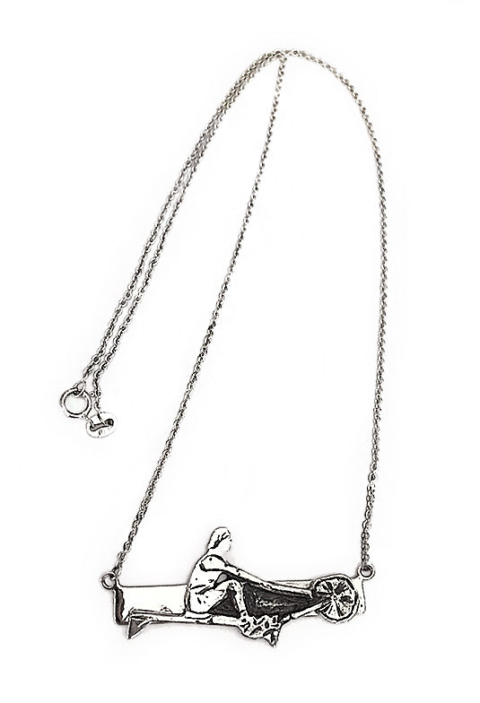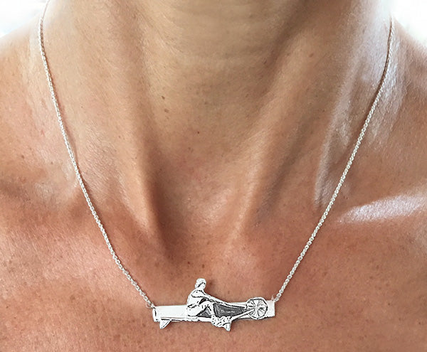 Sterling Silver. For the erging enthusiast, this stylish take on a grueling activity measures 18 inches including the bar. Bar alone is ~41mm (just over 1.5 inches), and the design from head to erg bottom is 17mm tall. Chain is 1.5mm thick solid round cable link chain with spring ring clasp. Design is lightly oxidized to enhance contrast.