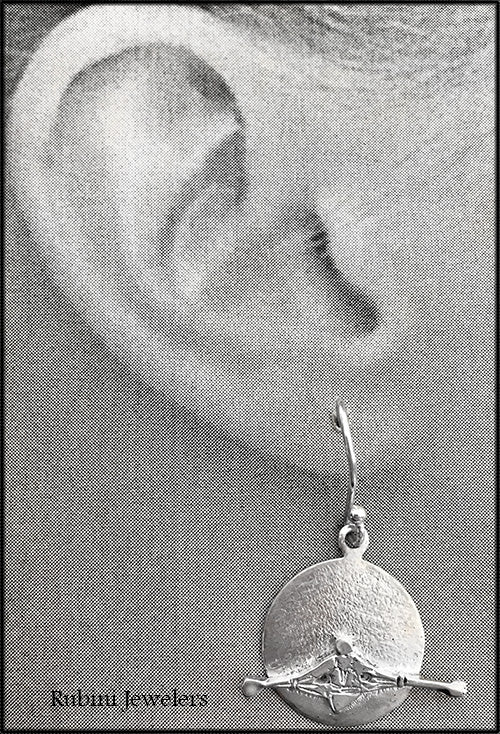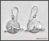 Sterling silver. The disc is 16mm diameter and the sculler measures just over ~22mm (or 3/4") from blade to blade. The discs (horizons) hang from French wires, and the overall length of the earrings from where they go through the ear to the bottom of the discs is ~32mm. There are sweet, sassy, dangle but not crazy.
