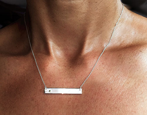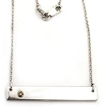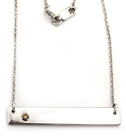 Chain and bar both are sterling silver. Bar measures 6mm tall by 36mm long (~1.5 inches), chain is 1.1mm cable link chain with lobster clasp. Genuine warm tone .015ct diamond. Overall necklace measures 19 inches long including the bar.