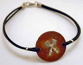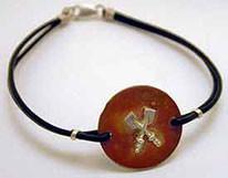 Bracelet has crossed hatchet oars in sterling silver on a natural-finish copper disc measuring 3/4 inch (19mm) diameter that will age differently for everyone. Cord is double 1mm leather with a sterling lobster clasp.