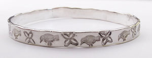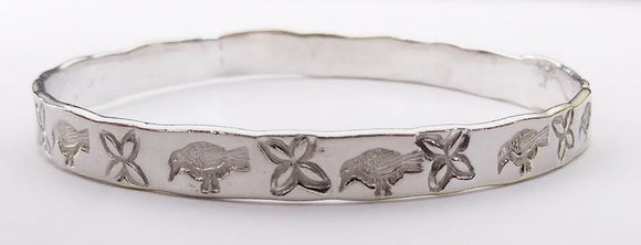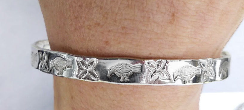 This delightful bangle is silver plated brass with a bird and flower pattern stamped into it around the entire bracelet.