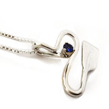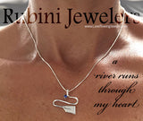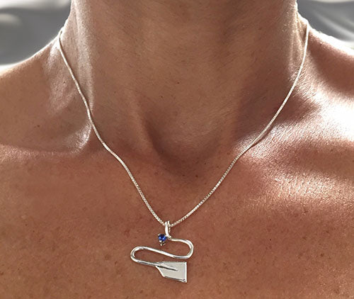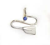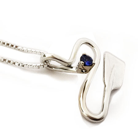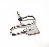 Sterling Silver. Genuine 3mm blue sapphire. A Rubini original, one of a kind, the undulating shape is a river. Overall pendant is 7/8 inch side to side and 7/8 inch top to bottom (~22 by 22mm). The hatchet rowing blade measures 12mm long (1/2 inch) by 7.5mm wide. Shown on a 1mm thick 18 inch box chain that is sold separately. Add chains or cord here.