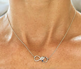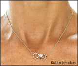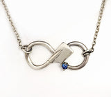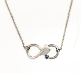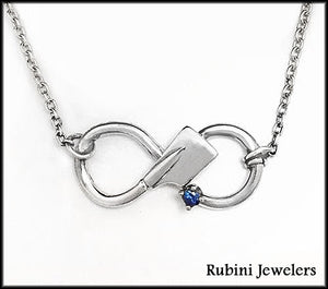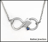 Sterling silver and genuine sapphire. Infinity measures 3/4 inch by ~1/3 inch (19mm by 8mm) and genuine natural source sapphire is 1.7mm. Chain is 1mm round cable link with spring ring clasp. Entire necklace measures just over 17 inches long including the infinity.