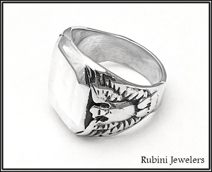 Sterling Silver. Made in house by Rubini Jewelers, the entire polished top including beveled edges measures 18mm by 15mm wide. Weight is 15.4 grams. Ring is size 8.5, shown on man's hand.