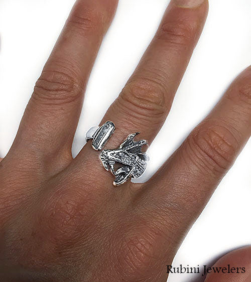 Sterling Silver. One of a kind, made in house by Rubini Jewelers. From top of fins to bottom of chin dragon is 21mm long (just over 3/4 inch), body with 1 fin is 10mm across and 3mm deep, and shank is 6mm wide by 3mm thick at back. As shown is an adjustable size 11. We can make it from size 10 to 12.