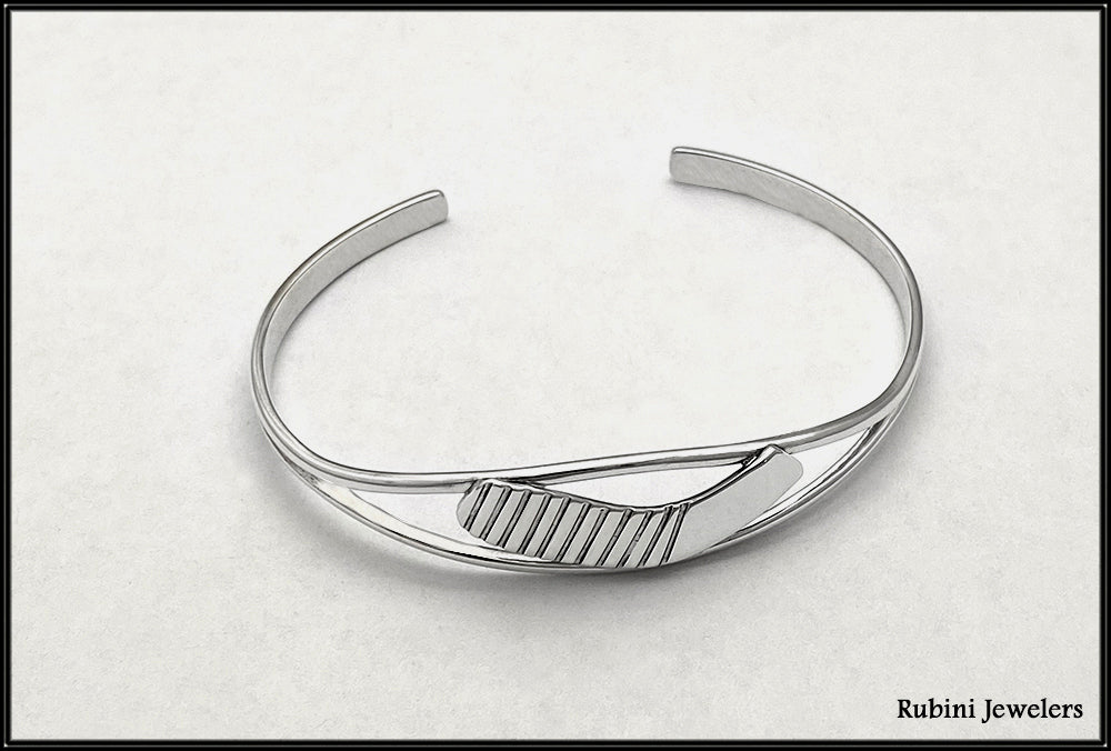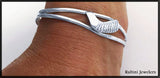 Sterling Silver. This cuff bracelet features the business end of a hockey stick and is great for wrists 5.5 inches - 6.5 inches circumference. The blade itself is about 20mm long.