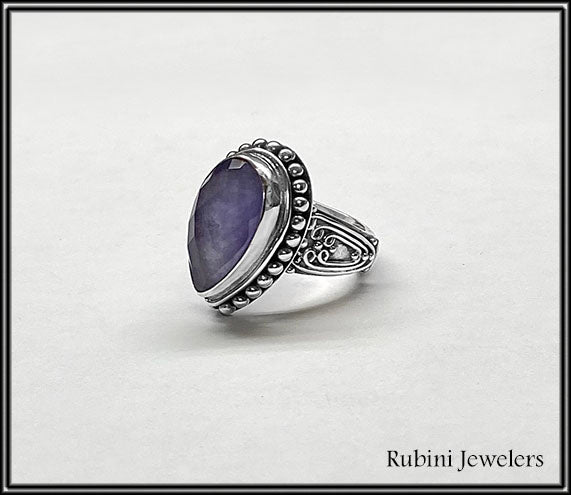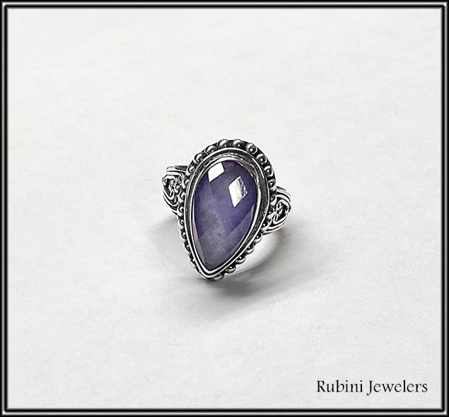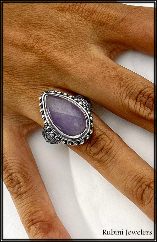 This ring features a beautiful faceted pear shaped lavender jade stone set in sterling silver with a beaded design.