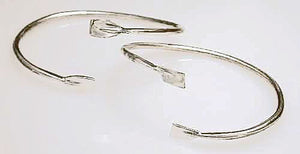 Sterling Silver. Choose from tulip (left) or hatchet (right). This bracelet is meant to be worn with the blades on top of the wrist which can be overlapped for smaller sizes. Wire is 2mm thick. If you tend to be impatient and accident prone, may we recommend a hinge style bracelet with less to catch on :o) Clean it with baking soda (either dry or as a paste), it can oxidize under sweaty acidic conditions.