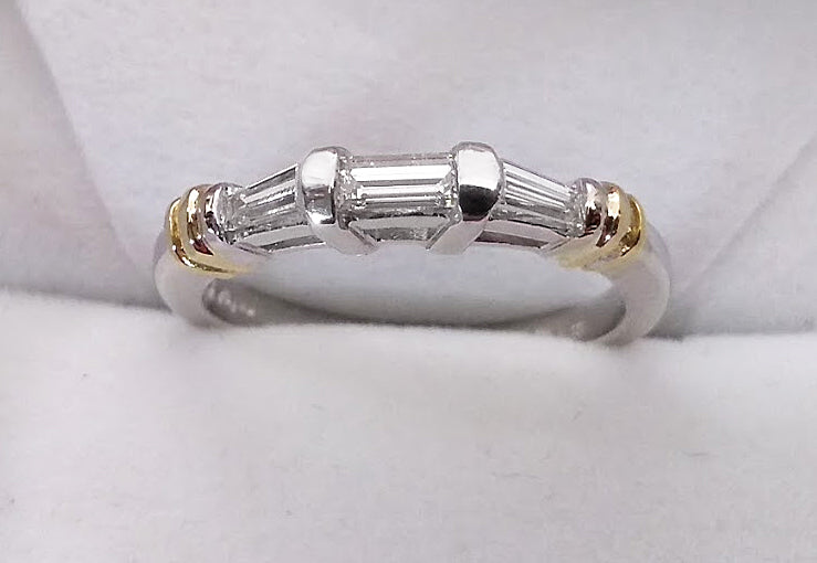 14K two tone gold band with a 4.5x2mm baguette diamond in the center and two 4mm tapered baguettes on the sides. Total weight of diamonds is .40cts.